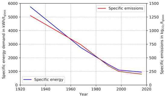 The specific energy demand is highly dependent on the glass type being produced, its batch and glass composition, the melting technology, and the furnace capacity. Improvements in energy efficiency and material utilization enabled the reduction of the specific energy demand from 4000 kWh/t glass in the 1930s to under 1000 kWh/t glass in 2016 (see Figure 1). Associated with this, the specific CO2 emissions per ton of molten glass have been reduced from approximately 1300 kg CO2-eq./t glass in the 1930s to an average value of 250 kg CO2-eq./t glass in 2016.