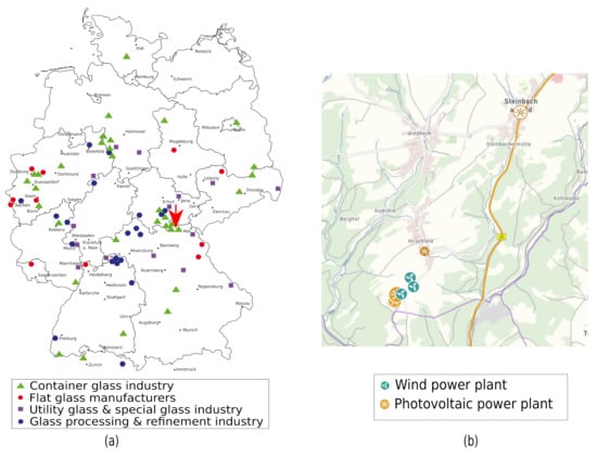 (a) Distribution of the glass industry in Germany, highlighting the selected location (red arrow, Steinberg am Wald) for the case study of the exemplary evaluation of CO2 abatement costs [].(b) Emergence of renewable energy in the vicinity of the selected case study site (i.e., Steinberg am Wald, latitude: 50.404387°, longitude: 11.332333°, WGS84 coordinates) [].