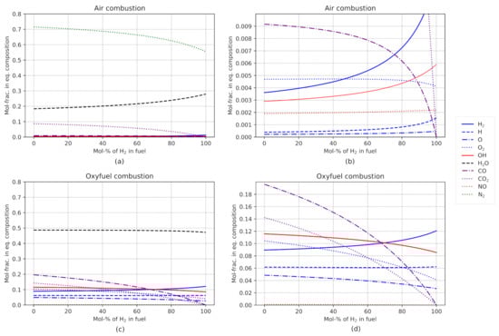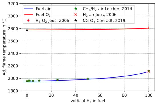 The adiabatic flame temperature is calculated within the open-source suite Cantera []. Thus, the GRI-MECH 3.0 mechanism is used to model advanced combustion phenomena []. This mechanism contains 325 reactions and 53 species, including higher chain hydrocarbons up to C3H8 and various intermediates, e.g., like NOx, OH−, O+, H+. The built-in Cantera algorithm is used to equilibrate the fuel and oxidization fluid using the Gibbs minimization solver.