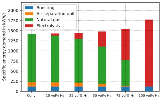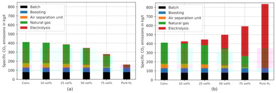 In addition, a conventional scenario is defined to provide a basis for the evaluation of the changes caused by the PtH2 process introduced. The conventional scenario is defined as a steady-state operating oxyfuel glass melting furnace with a pull rate of 100 t/d and additional electrical boosting, covers a constant share of 10% of the required heat demand. A soda-lime glass, which is typical for the container glass industry, is melted. As a fuel mixture, the composition given in the “Conventional” column of Table 2 is used as natural gas H from Russia []. The O2 supply for the oxyfuel combustion is completely provided by an ASU, which uses electricity from the German grid.