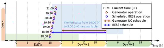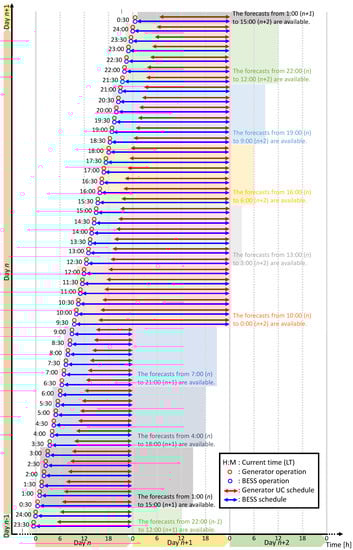 On Day n, the BESS charge/discharge power and the thermal power generator outputs are set at time . When is between 0:30–9:00 LT, the charging and discharging schedule from h to 24:00 LT of the same day (day n) and the generator UC schedule from + 6 h to 24:00 LT of the same day is calculated. When is between 9:30 and 24:00 LT the charging and discharging schedule from h to 24:00 LT of the following day (day ) and the generator UC schedule from + 6 h to 24:00 LT of the following day is calculated.
