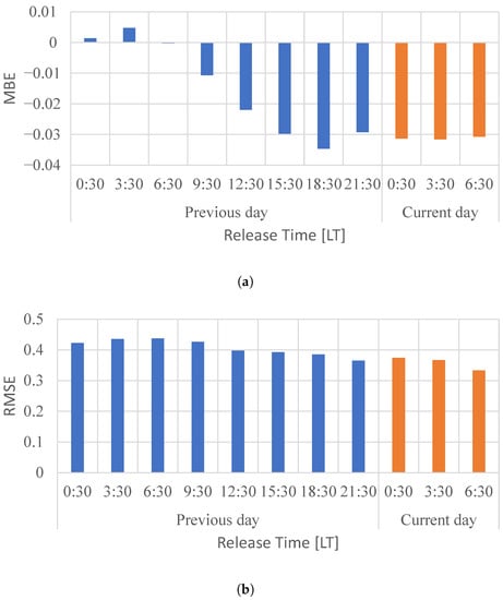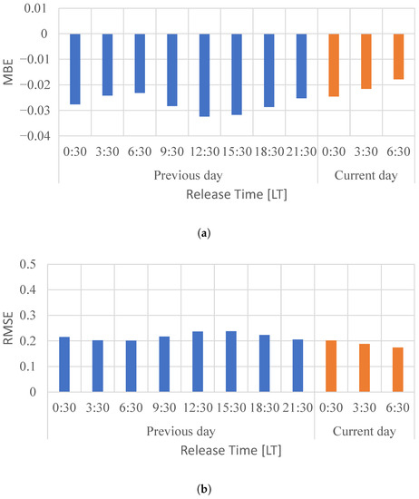 Most of the MBEs are negative, which indicates that the PV power outputs tended to be under forecasted. The forecasts seem improved with time because the RMSEs tend to become small with the release time. The RMSE values in Figure 3b are larger than those in Figure 4b because of high solar irradiance in April.