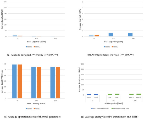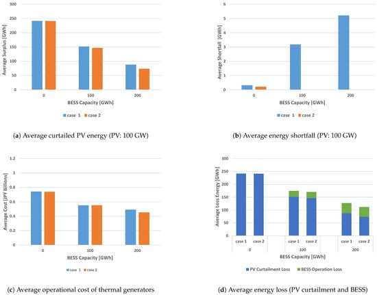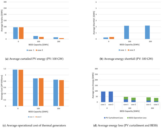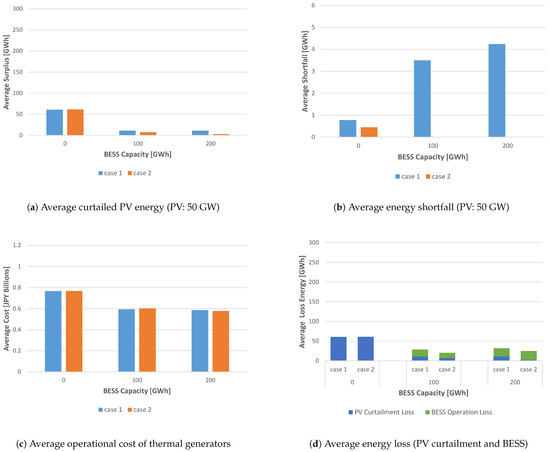 The total energy losses shown in Figure 5d, Figure 6d, Figure 7d and Figure 8d are the sum of the curtailed PV energy (blue) and the BESS (green) charge/discharge energy loss. With the BESS operation, it is important to reduce the total loss as well as the curtailed PV energy. The total energy loss becomes small with larger BESS capacity except for Figure 7d where the PV curtailment without BESS is quite small. When the BESS is used, the energy loss in Figure 7d mostly consists of the loss due to BESS charge/discharge. That is because the PV curtailment can be reduced to almost zero with 100 GWh BESS as well as 200 GWh BESS as shown in Figure 7a. The total energy loss in Case 2 tends to be smaller than that in Case 1 for each BESS capacity in Figure 5d, Figure 6d, Figure 7d and Figure 8d, respectively. However, the energy loss due to charging and discharging in Case 2 is not always smaller than that in Case 1 (e.g., Figure 7d). It is because the objective function for the schedule update and operation is set not for minimizing the total energy loss but for minimizing the operational cost of the thermal generators. Therefore more charging and discharging occur with 200 GWh BESS capacity. As a result, the cost with 200 GWh BESS is smaller than that with 100 GWh BESS as shown in Figure 5c and Figure 7c although the total BESS charge/discharge loss is larger.