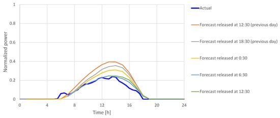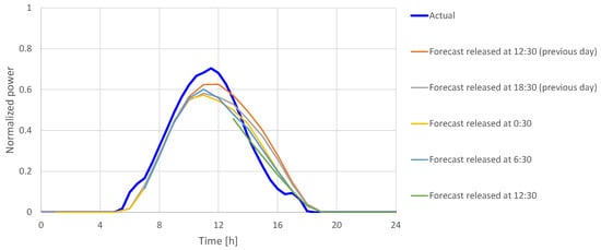 | The forecasted PV power output at time t on day d that was released at time | |