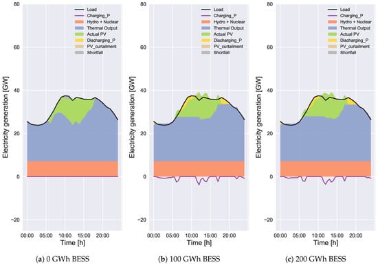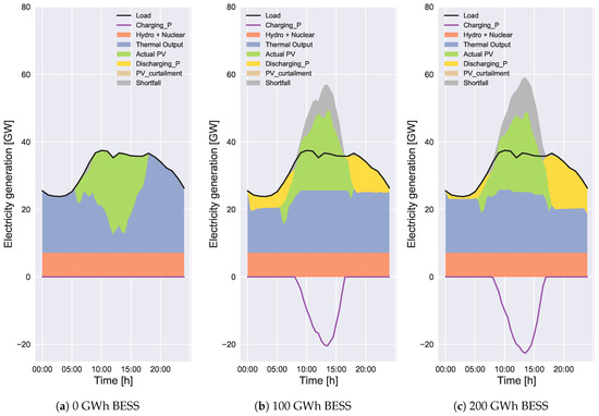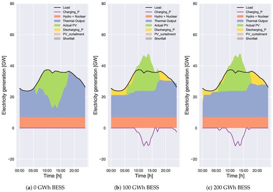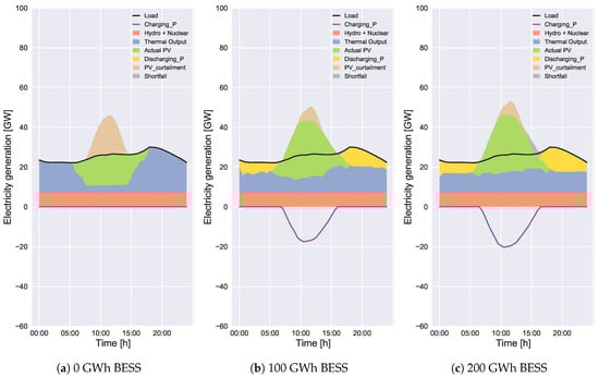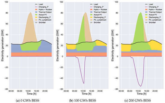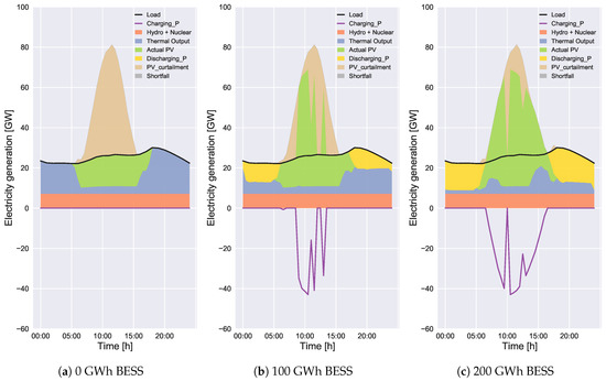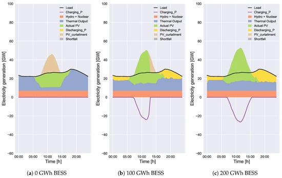 According to Figure 5a, Figure 6a, Figure 7a and Figure 8a, the total curtailed PV energy decreases with the increase of BESS capacity. The total curtailed PV energies in Figure 7a and Figure 8a are much smaller than those in Figure 5a and Figure 6a, respectively, because of lower solar irradiance. The amounts without BESS in Case 2 in Figure 7a and Figure 8a are 11% and 39% of those in Figure 5a and Figure 6a, respectively. The PV curtailment can be completely avoided in Case 2 with 200 GWh BESS in Figure 7a. The proposed scheduling method (Case 2) reduces the PV curtailment compared to convectional scheduling (Case 1). The effectiveness of the Case 2 method becomes large with the increase of BESS capacity. According to our study, the PV curtailment for months with lower solar irradiance can be reduced to almost zero with BESS. Similarly, in a study by Wang et al. [23], the wind power curtailment has been reduced to zero with the energy storage by increasing the operational cost. In our study, the PV curtailment for months with higher solar irradiance can be unavoidable even with BESS. It is because the energy surplus cannot always be charged (or discharged) because of the SoC constraint when the installed PV capacity is so large, which will be presented in detail in Section 3.2.2.