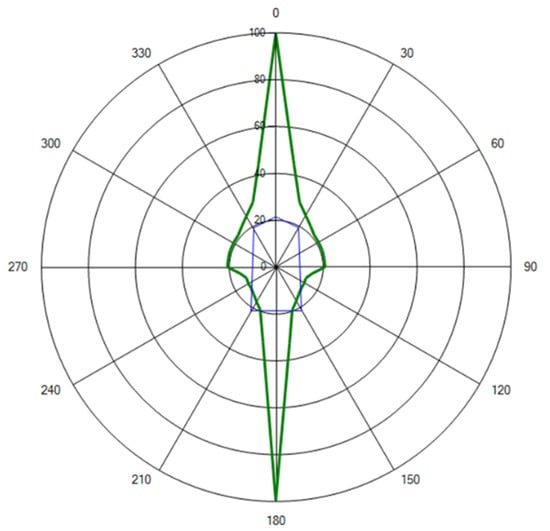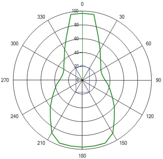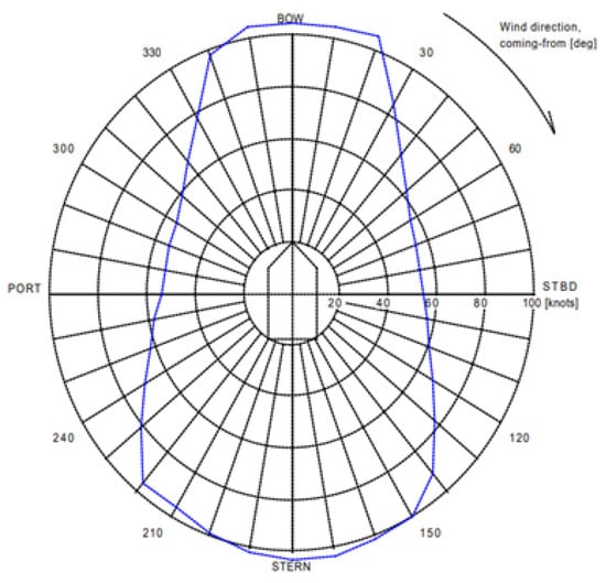 Other requirements that must be met by a vessel with a dynamic positioning system is to have up-to-date graphs of the ability to maintain position, the so-called capability plots (CP) [25]. They are performed so that in the event of a DP system failure, it is possible on their their basis to decide the ship’s course in order to minimize the influence of wind on the ship’s position. Capability plots can be performed by companies certified by the International Maritime Organization. Figure 1 shows an example of a CP chart.