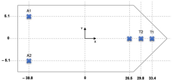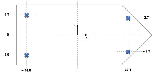 where: —unknown thruster forces; unknown angles of the thruster force; —position of the thruster on the X axis of the ship; —position of the thruster on the Y axis of the ship.