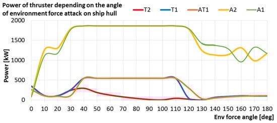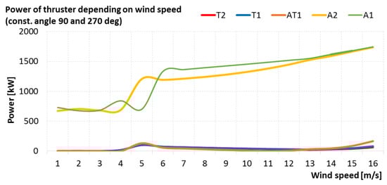 The speed of the sea current in capability plots is constant at 0.5 m/s as per [26], and its angle is equal to the wind angle. Using the relationship between the generated thrust and thruster power, given in [26], it is possible to determine the characteristics of power consumption from wind speed, which in turn can be used to estimate energy consumption and fuel consumption during positioning. The dependencies of power consumption on wind speed presented in the further part of the article were determined on the basis of the proprietary program for creating capability plots, developed in the C# language environment and with the help of the LocalSolver library [27]. This library allows to derive optimums for nonlinear functions.