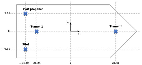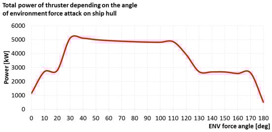 where: XForce—thruster force acting on the X axis of the ship; YForce—thruster force acting on the ship’s Y axis; M—torque generated by the thruster; FTT—total thruster force; PosX—the position of the thruster on the X axis with respect to the point LPP/2 [m].