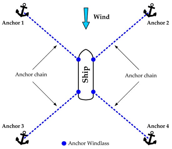 In addition to ships equipped with thrusters only, there are vessels that have been equipped with a basic set of thrusters and a set of anchors intended for positioning. Examples of such vessels are bottom drilling vessels [28], rescue vessels that cooperate with divers, and wreckage vessels. The biggest advantage of positioning based on an anchor set is zero or very low ship energy consumption for positioning itself, which follows the current trends in ecology and is in line with the Ship Effective Energy Management Plan (SEEMP) [29], which was introduced by the International Martitime Organization on 1 January 2013. According to this plan, ships should, among other tasks, monitor fuel combustion, maintain fuel system equipment, maintain an appropriate fuel mixture and take advantage of fuel saving opportunities. The positioning system with an anchor set definitely favors the latter.