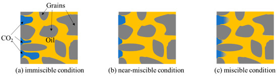 Figure 1 shows a schematic pore-scale view of CO2 flooding in oil-saturated porous media under immiscible, near-miscible, and miscible conditions. Under the immiscible condition, there is an obvious CO2–oil interfacial intension (Figure 1a) [7,16]. Under the miscible condition, CO2 and oil would mix, and in this case, the interfacial tension disappears, which results in an easy single-phase flow in porous media (Figure 1c) [19]. Near-miscible CO2 flooding has smaller interfacial tension than immiscible flooding and weaker diffusion than miscible flooding (Figure 1b) [20]. Generally, pressure is an important index for distinguishing these flooding methods. When minimum miscibility pressure is reached or exceeded, CO2/oil flooding is miscible flooding, or else it is immiscible flooding. Furthermore, according to Chen et al. [21], the lower- and upper-pressure boundaries for effective near-miscible flooding at reservoir temperatures are 0.87 and 1.07 MMP, respectively. The main differences in these three flooding methods are summarized in Table 1.