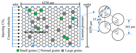 A 6330 × 4379 μm rectangle is specified as the model domain (Figure 2). The size of the domain exceeds the size of a representative elementary volume [16,31]. The domain is comprised of circular particle grains and pore spaces. Particle grains have a diameter (Dp) of 350 μm, and the pore throat diameter between them is 15 μm. Then, twenty grains are randomly selected, and their diameters are reduced or enlarged by 5% of the normal diameter, respectively, as shown in Figure 2. Consequently, all of these grains constitute a heterogeneous porous medium, with a porosity of 0.17.