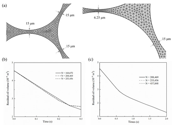Moreover, we especially test the mesh independence of the pore-scale simulation. Figure 3a shows the generated meshes for all simulations that have at least three elements in the narrowest channels. The calculated residual oil volume is almost the same when specifying different numbers of triangular elements (Figure 3b,c). Thus, the number of triangular elements is specified to be 208,469, with the smallest and biggest element size being equal to 0.1 and 8 μm, respectively.