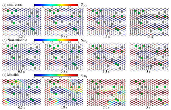 The temporal evolution of the computed CO2 saturation distribution under immiscible and near-miscible conditions is shown in Figure 4a,b; the calculated CO2 concentration evolution under the miscible condition is presented in Figure 4c. The different particle sizes lead to pore structure heterogeneity, which, accordingly, causes the fingering under all three conditions. Comparatively, immiscible flooding has the smallest capillary number ( C a = μ CO 2 u in σ , Ca =3.31 × 10−5). The smaller Ca means that the capillary force exerts stronger effects on CO2 migration [41,42]. The CO2 plume mostly migrates through the larger pore throat, which is formed by the small grains and has smaller capillary resistance (Figure 4a). The final oil recovery efficiency is low and only reaches ~35% (Figure 5). Compared with immiscible flooding, the fingering of near-miscible flooding is improved to a certain extent. Due to smaller interfacial tension, CO2 can invade more normal pore throats that CO2 cannot enter under immiscible conditions (see the region enclosed by the dotted ellipse in Figure 4b), and, thus, the sweep areas become larger and the fingering numbers increase (Figure 4b). Final oil recovery can reach ~50%, which is about 40% higher than the value under immiscible conditions. It needs to be indicated that after the CO2 phase breaks through the porous media, the residual oil in pores cannot be displaced by continued CO2 injection any more under the immiscible condition, while under the near-miscible condition, the oil in some pores can still be replaced by continued CO2 injection, which is also consistent with the experimental observations of Cao and Gu [8].