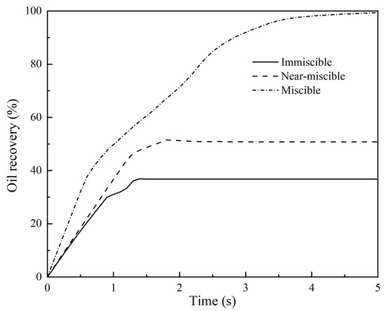 Figure 5. Oil recovery under immiscible, near-miscible, and miscible conditions.
