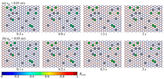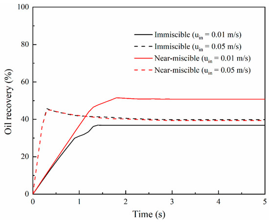 Increasing the flow rate of CO2 is usually one of the most important ways for CO2-EOR to decrease residual oil at the field scale [2]. Thus, we also compared the calculated oil recovery at different CO2 injection velocities (0.01 and 0.05 m/s) under immiscible and near-miscible conditions at the pore scale. As shown in Figure 6, under the immiscible condition, a bigger injection velocity has better oil recovery performance, which is consistent with the experimental observations and simulation results of previous studies [23,42,48]. The enhancement of injection velocity leads to an increase of 7% in oil recovery. Under the near-miscible condition, the increasing injection velocity significantly speeds up the flooding process. In less than 0.3 s, CO2 breaks through the porous media, while at the lower velocity, the time exceeds 0.8 s, as shown in Figure 7. Due to the shortened breakthrough time during which displacement mainly occurs, the sweep area becomes smaller at the bigger CO2 injection velocity. Consequently, the increasing injection velocity contributes very little to the enhancement of oil recovery and even has a negative effect on oil recovery. Final oil recovery at uin = 0.05 m/s is about 40%, which is lower than the value (~50%) at uin = 0.01 m/s. All of these inferences are also consistent with the experiment results of Abedini et al. [48], which indicated that ultimate oil recovery was much less dependent on CO2 injection velocity under near-miscible conditions and that increasing the injection velocity of CO2 cannot increase oil recovery under the immiscible condition either.