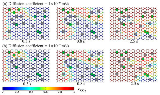 The rate at which CO2 diffuses in oil is an important parameter for CO2-EOR, but it is often uncertain [49]. Temperature varies in a range from 298 to 423 K for most oil reservoirs. The CO2 diffusion coefficient generally increases with increasing temperature, and the CO2 diffusion coefficient lies in a wide range from 1 × 10−10 to 1 × 10−7 m2/s [34]. The calculated temporal and spatial evolution of the dissolved CO2 plume when the CO2 diffusion coefficient is, respectively, equal to (a) 1 × 10−9 and (b) 1 × 10−7, which correspond to two different Péclet numbers ( P e = u in D p D ; 3500 and 35), are shown in Figure 8. We identify the flow behavior of CO2 under the miscible condition through the tracking of concentration iso-surfaces, herein referred to as the concentration front interface. The viscous fingering is the dominant transport regime at the beginning of flooding (Figure 8b). As Pe increases, both heterogeneity-induced channeling and viscous fingering still occur. The effect of the different Pe on miscible displacement in heterogeneous porous media was also simulated by Afshari et al. [39]. The preferred flow paths are the ones with the smallest resistance to flow and transport in the porous media.