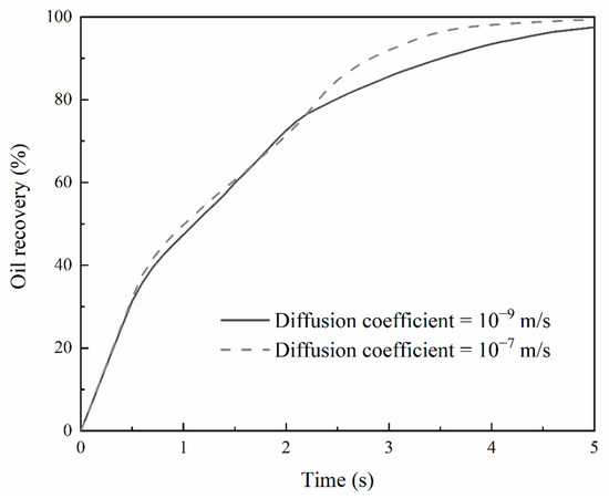 Figure 9. Oil recovery at the diffusion coefficient of 1 × 10−9 and 1 × 10−7 m/s under the miscible condition.