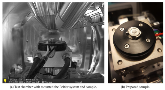 The purpose of the analysis described in this section was to observe whether and how the internal structure of the PCM changes at the characteristic temperature points. The structure of the material was studied while using a Scanning Electron Microscope (SEM). A Prisma E scanning electron microscope from Thermo Fisher Scientific was used for this purpose. A special table with a Peltier system was installed in the test chamber in order to regulate the sample temperature in the phase transition range, i.e., from 0 °C to 16 °C. Figure 1 shows the system with the studied sample along with the details of the test chamber.