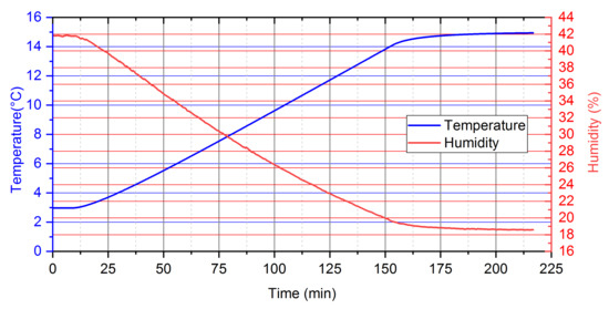 Efforts were made to keep the relative humidity value in the measuring chamber at 17 ÷ 42% in order to maintain the emulsion structure of the sample during the analyses of the PCM structure. Maintaining these parameters ensured that the evaporation of water from the material was minimized by achieving thermal conditions far from saturation conditions. Figure 2 presents the change in sample temperature and humidity during the experiment.