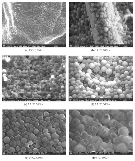 Figure 3 presents the results of the SEM’s investigation of the PCM structure for selected temperature points that were defined at 0 °C, 5.5 °C, and 15 °C.