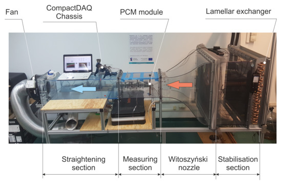 In Section 1, it was mentioned that the tested PCM is dedicated to working in a special storage heat exchanger/tank [38,39]. It was decided that the PCM, due to the design of the heat exchanger, should be studied in a cylindrical system for the conditions most similar to those in which it will be operated later. For this purpose, a wind tunnel, as presented in Figure 4, was used that met the operational and functional parameters. The obtained range of the Reynolds numbers (15,260–52,767) is fully turbulent and the heat transfer conditions (temperature and the Nusselt numbers) are similar to the considered storage tank.