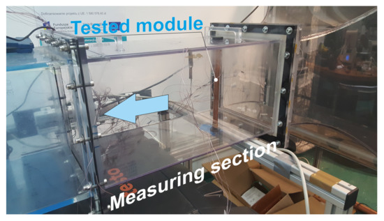 The module has been specially prepared in order to test the thermal behaviour of the module filled with the PCM for various thermal-flow conditions. First, before filling with the PCM, the module was degreased with propyl alcohol and thoroughly dried. Next, three T-type thermocouples with an accuracy of ±0.5 °C were placed in the prepared arrangement in the configuration that is shown in Figure 5. Subsequently, the module was filled with the phase change material. Before testing, the module was placed in a freezer for about 4 h to cool to a temperature of about −18 °C. The freezing process was completed when the material obtained the same temperature in the entire volume, which was monitored by thermocouples that were placed inside the module. The module prepared in this way was then mounted in the wind tunnel measuring section. Figure 6 presents the measuring section with the installed PCM module.