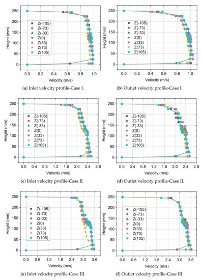 Before the measurement campaign, the velocity profiles at the inlet and outlet were determined. The measurements of the velocity profile were carried out at a distance of 20 mm from the inlet and outlet edges of the measuring section. The velocity profiles were determined at measuring points 33, 73, and 105 mm from the channel’s symmetry axis.