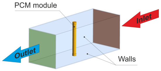 The geometry used during numerical calculation is based on the experiments that are described in Section 3. For the purpose of simplifying the calculations, only the measuring section is modelled. Figure 8 presents a scheme of the studied case. During the simulation, to the rectangular duct, made of plexiglass, hot air of a temperature 24 °C inflows according to the experimentally obtained uniform velocity changing in a range of 0.92 ÷ 3.18 m/s. The duct is 0.7 m long and the inlet surface is a square, with a side length of 0.25 m. The wall thickness of the duct is 3 mm. In the middle of the duct, the copper cylinder with an outer diameter of 15 ÷ 28 mm and 250 mm long is set. To close the module, pipe caps that were made of copper, 15 mm long and 15 ÷ 28 mm in diameter, were mounted at the ends of the test element. The cylinder and bases are hollowed and the wall thickness is 1 mm. The inside of the cylinder is filled with the tested PCM. The air outflow has an atmospherical pressure of 1 bar.