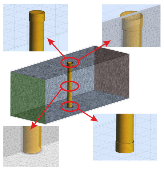 The geometrical model that is presented in Figure 8 was discretized in space with the use of Ansys Meshing software. A tetragonal mesh was used within the air and PCM space. Solid elements were discretized while using hexahedral elements. Additionally, on the outer and inner surfaces of the cylinder 12 inflation layers have been applied. The thickness of the first element adjacent to the wall was set to 0.1 mm. In order to ensure energy transfer between solid and fluid regions, the applied meshes were non-conformal and were connected with the use of coupled wall boundary condition [47]. Figure 9 presents the employed mesh with details.
