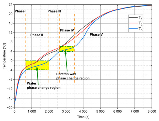 Generally, from the performed experiments, it can be concluded that the heating process of a module filled with the PCM can be divided into five phases. This solution is unique in comparison to homogeneous PCM systems, where only three phases can be observed [49,52,53]. In the first phase, starting with a uniform initial temperature of −18 °C throughout, the mixture of paraffin wax and water coexisted in solid form is heated. This phase that is presented in Figure 10 as Phase I is characterised by a linear temperature change with a high value of the inclination angle of the characteristic. There are two reasons why temperature increases rapidly. The first reason is related to the fact that in this temperature range there is the highest temperature gradient between the tested module and the air flowing outside; therefore, the highest temperature driving force occurred. The second reason may also be that ice has half of the specific heat lower than water.