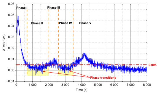 The identification of the aforementioned phase transitions for ice-water and paraffin wax can also be observed in Figure 11. If a derivative of the temperature function dT/dτ versus time is determined, then the first two “valleys” of the function with values smaller than 0.005 °C/s can be interpreted as the phase transitions (areas marked in yellow in Figure 11). The rest of the derivative close to zero starting around 6000 s describes the so-called steady-state process, i.e., the temperature in the module reached about 90% of the ambient value.