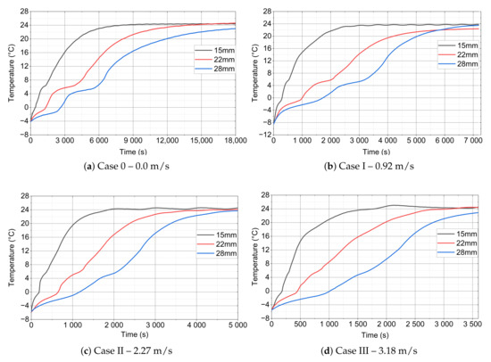 The experimental tests were carried out for the outer diameters of 15, 22, and 28 mm, and the thermal-flow conditions obtained in the wind tunnel, as defined in Table 3. This combination of the outer diameters and air tunnel conditions necessitated 12 measurements. Figure 10 shows a representative example of the heating process for a module with an outer diameter of 28 mm and an air flow rate of 0.92 m/s (Case I).