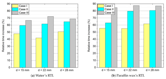 - Because of the use of forced convection, the time of the melting process can be reduced by even up to 87% (RTI) as compared to stagnation conditions, as shown in Table 6 and Table 7 and Figure 13. It is also worth emphasising that, when changing the outer diameter from the module from 22 to 28 mm, these changes are less noticeable than for the diameters of 18 to 22 mm.