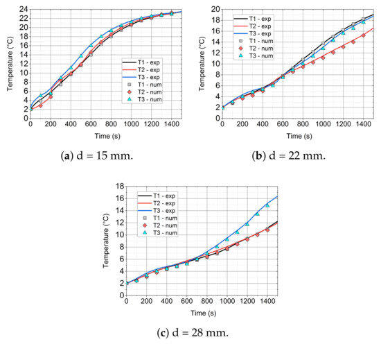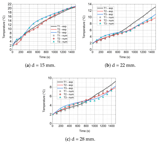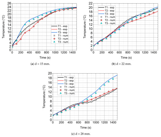 The PCM mass contribution in the module varied from 25.23% to 37.82%, (see Table 2). The theoretical heat transfer from the air to the modules were estimated and presented in Table 2, according to the producer information, as described in Table 1 and assumptions concerning paraffin and copper properties used during the numerical calculations, as summarised in Table 4. For paraffin, it varies from 2.87 kJ to 10.19 kJ for sensible heat and from 2.46 kJ to 8.74 kJ for latent heat. For copper the heat transfer varies from 1.62 kJ to 3.71 kJ. The heat storage in copper is 23.31% for d = 15 mm, 20.78% for d = 22 mm and 16.37% for d = 28 mm of the total system, respectively. Those estimations show that PCM phase change plays an important role during the heating of the module that is filled with the PCM.