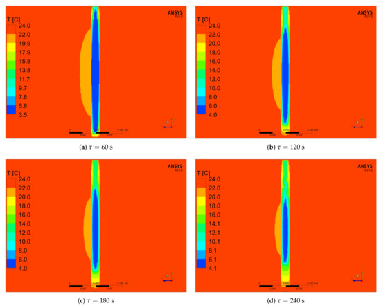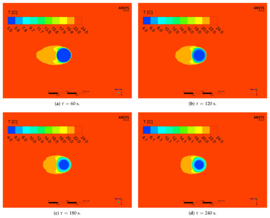 Over time, the isotherms of high temperature propagate into the interior of the PCM. Behind the cylinder, a wake is developing, which gives rise to change temperature distribution in the front of, as well as in the back, of the cylinder (see Figure 18). The differences in temperature distribution around cylinder are caused by increasing local heat transfer coefficient, which was described by Cengel [59] and Incropera et al. [60]. At the beginning (Figure 18a,b), behind the cylinder, one large area of lower temperature exists. For greater times (Figure 18c,d), this area slightly shrinks and its length behind the cylinder is shortened. This process is caused by changes in temperature difference between the cylinder and air. With an increase of the PCM temperature, the temperature difference decrease; therefore, the air faster reach surrounding temperature.