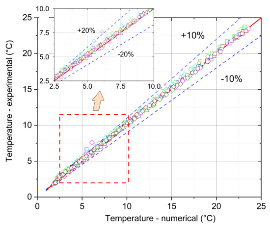 As it results from the comparison of the results that were experimentally obtained with the results obtained from the proposed numerical model, presented in Figure 19, the relative error in a wide temperature range does not exceed 10%. However, it has been observed that at the beginning of the heating process and in the temperature region where the phase change occurs, this error can reach even 20% (see enlarged analysis region in Figure 19 in the upper left corner). A few factors could cause the observed differences between the numerical and experimental results, in particular, in the initial heating phase and in the phase change region. During the numerical calculations, only pure paraffin wax was analysed. In the experiment, paraffin wax that was capsuled in the melamine-formaldehyde membrane micro-capsules was used. Such an interior structure is difficult to model and it was not considered in the simulations. Moreover, during the preparing of the experimental set-up, unintentional human errors could occur, e.g., imperfect placement of the thermocouples in the module axis or its movement due to a melted PCM, which can result, in particular, in the region of phase change. In the numerical investigations, boundary conditions were averaged and stable during the heat transfer processes. On the other hand, in the experiment, chiller hysteresis caused unstable inlet air temperature and, therefore, unstable boundary conditions. Another thing could be the air humidity impact on the heat transfer when the air dew point temperature was higher than the module temperature. During this situation, vapour from the air condensed on the module walls, which probably caused an intensification of heat transfer.