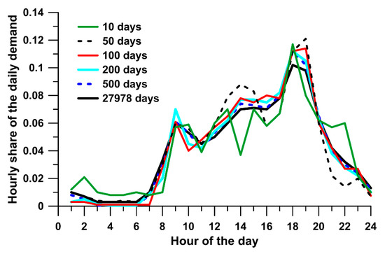 Profiles describing the period during an average day in which the driving takes place, i.e., the share of the daily driving distance distributed over the day, for different numbers of sample sizes of representative days (27,879 is the full-sample size).