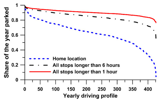 Figure 2 shows, for the 426 yearly driving profiles, the share of the year being parked at the home location, all parking at stops longer than 6 h, and all parking at stops longer than 1 h. Large variability is seen between the 426 yearly driving profiles in terms of the numbers of kilometres driven per year (see Figure A1 in Appendix C) and the driving profiles and hours being parked per year (Figure 2). This shows that the different driving profiles most likely need to be charged differently and have different conditions for participating in V2G.