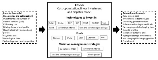 The cost-minimisation model of the electricity system, ENODE, is both an investment and dispatch model designed to analyse investments in electricity generation capacities and storage technologies, and the hourly dispatches of different technologies. It is also a Greenfield model (i.e., assumes an empty system as the starting point without any generation capacity in place). This can be motivated, since we assume no net CO2 emissions for the modelled year (2050) and thereby almost all of the current capacity needs to be replaced. The model has an hourly time resolution, run for 1 year and without inter-connections between regions. Figure 3 shows a schematic picture of the modelling applied in this work.