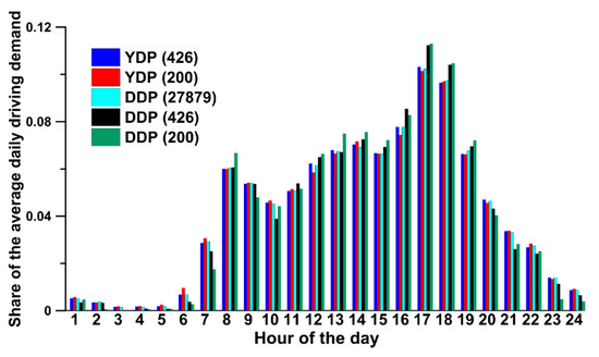 Figure 4 shows how the driving demand is distributed over an average day of the year. Figure 4 compares representative daily driving profiles (DDP) with yearly driving profiles (YDP) for an average day, i.e., the share of the daily driving distance distributed over the day. The DDP is based on 200, 426, and 27,879 representative daily driving profiles and the YDP is from 200 to 429 yearly driving profiles. As shown in Figure 4, the DDP or YDP gives approximately the same average driving profile.