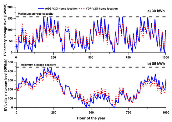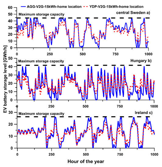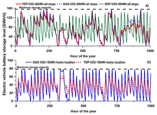 AGG, DDP, and YDP use the same set of equations (Equations (3)–(8)) to integrate EVs, thus, with some important exceptions. In the AGG approach, all vehicles are in the same aggregated vehicle profile, i.e., the number driving profiles (DP) equals one. For the DDP and YDP approaches, the number of driving profiles equals 200 and 426, respectively. Thereby, the parameter FAdp,t, used in Equation (5), is in DDP and YDP, either 1 or 0 depending on whether or not the vehicles belonging to driving profile dp are parked and connected to the grid (FAdp,t = 1) or not (FAdp,t = 0) at time-step t. In AGG, which only have one aggregated driving profile, FAdp,t is instead a share of the fleet (i.e., a number between 0 and 1) that is connected to the grid available for charging or discharging to the grid at timestep t.