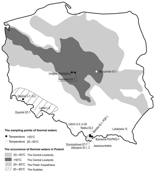The temperature and mineralisation of Polish thermal waters range from 21 °C to 86 °C and from 210 mg/L to 120 g/L respectively. Water from the Lądek Zdrój L-2 has the lowest mineralisation (210 mg/L), and the thermal waters from Ustroń have the highest (over 100 g/L). The chemical compositions of the study waters are different, and belong to hydrochemical types such as: HCO3-Ca-Mg, HCO3-Na-Ca, SO4-Cl-Na-Ca, Cl-Na-Ca and Cl-Na. In the case of thermal waters from the Polish Inner Carpathians, the hydrochemical type of water changes from HCO3-Ca-Mg (near the Tatra) to SO4-Cl-Na-Ca (near the Pieniny Klippen Belt).