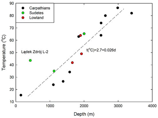 Excluding the water from the Lądek L-2 intake, all the points are scattered on the line t (°C) = 2.7 + 0.026 d (m) where d is the depth expressed in metres. Assuming that there is a thermal equilibrium between the thermal water and the rock aquifer, the coefficient at depth d can be regarded as the geothermal gradient and equal to 2.6 ± 0.4 °C per 100 m. This value is comparable with that earlier published for these regions [,].