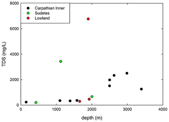 There is no clear dependence of water mineralisation on the depth of the water hosting formation (Figure 4) but there is an increasing tendency to mineralisation.