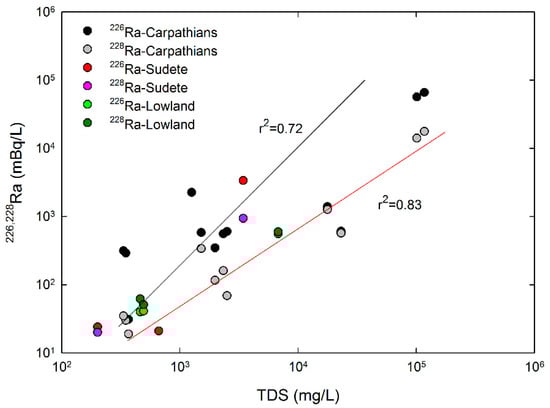 Relationship between the log of radium isotopes’ concentrations and mineralisation (TDS) in Polish thermal waters.