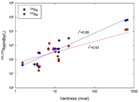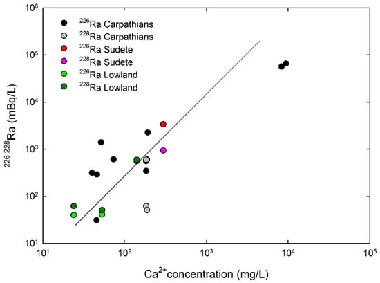 The correlation coefficient is r2 = 0.83 for 228Ra (dark red line) and r2 = 0.73 for 226Ra (black line). Additionally, there is a clear linear correlation between the concentration of radioactivity of radium isotopes and the concentration of Ca2+ ions (Figure 6).