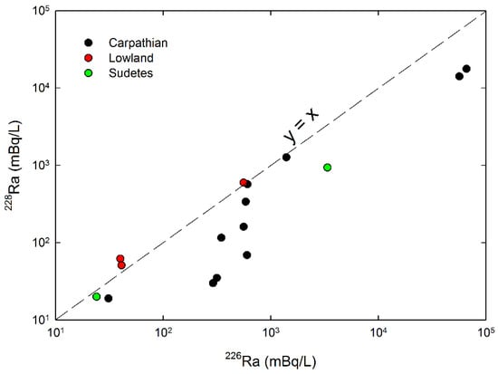 The ratio of the radioactivity concentration of radium isotopes (226Ra/228Ra) in groundwater is not only related to the relationship between the uranium and thorium content in the aquifer rocks, but also to the residence time in the underground aquifer as well as to the desorption/absorption coefficient of the groundwater [,]. In the case of the Carpathian and the Sudeten regions, the occurrence of thermal waters is mostly in limestone aquifers where the concentration of radioactivity of uranium is often higher than that of thorium (the ratio of concentration of radioactivity of 232Th/238U is 0.8). This is more due to the desorption coefficient of the thermal water being higher at high temperature than that of the water with low temperature. In consequence, the concentration of 226Ra is higher than that of 228Ra. In the case of waters from the Polish Lowlands, the concentration of radioactivity of 226Ra is lower than that of 228Ra (the 226Ra/228Ra ratio is less than one). This fact can be related to the content of uranium and thorium in the sandstone aquifer of the thermal water in this region in which the average activity ratio of 232Th/238U is approximately 2.3 []. Additionally, in this area the groundwater is probably mixed with infiltration water [], resulting in the radium concentration being low and only reaching several tens of mBq/L.