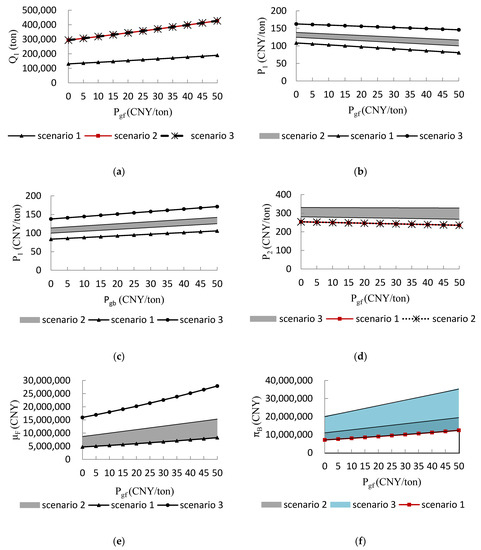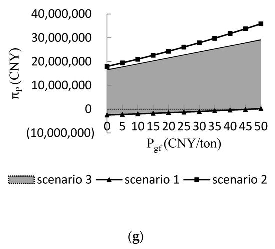 The government incentives for farmer and broker have the same incentive effect on the equilibrium solutions except for the broker’s purchase price. Therefore, in this section, the changing trends of the equilibrium results are shown under different government incentive for farmer in the noncooperative game, the farmer–broker cooperative game, and the broker–biomass power plant game. The changing trend of the broker’s purchase price is also shown under different government incentive for broker since the government incentive for farmer and government incentive for broker have different effects on it. Figure 3a–g represent the optimal decision strategies and the profits of , under government incentive for farmer, under government incentive for broker, , ,, and , respectively. Since the values of and are unknown, the shaded part in the figure is the variation range of the equilibrium solutions in a certain scenario.