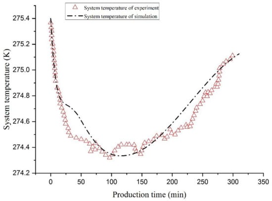 Figure 3 shows the temperature change of the core at point T3. It can be seen from the figure that the results of the numerical analysis are basically consistent with the trends of the experimental results. The decomposition of natural gas hydrate is an endothermic process. As the mining progresses, the hydrate gradually decomposes and absorbs heat in the model so that the temperature at point T3 gradually decreases. At the same time, the ambient temperature at the wall boundary transfers heat to the inside of the reactor. When the ambient temperature can provide enough heat for the dissociation reaction of NGH, the temperature starts to increase until it reaches the ambient temperature of 275.25 K. Therefore, the temperature curve shows a downward trend followed by an upward trend.